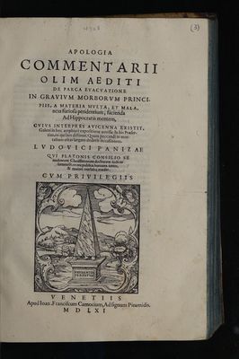 Apologia commentarii olim aediti de parca evacuatione in gravium morborum principiis, a materia multa, et mala, non furiosa pendentium, facienda. Ad Hippocratis mentem, cujus interpres Avicenna existit, Galeni in hoc amphivii expositione omissa: in his praesertim, in quibus dissonat ... / [Ludovico Panizza].