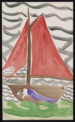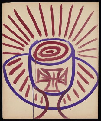 Red diagonal and vertical lines, and crosses, with a rounded shape and two faces in profile