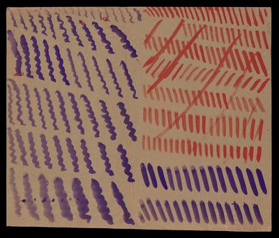 Purple and red diagonal lines, red hooks, crosses and blotches, and purple loops