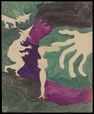 A naked woman with two witches to her left and a large hand to the right, on a pink, green, purple and black ground