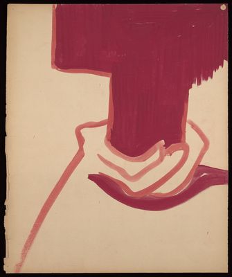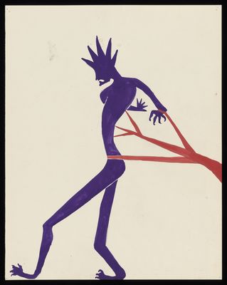 Red straight and diagonal lines and a pair of purple arms with a stem of loops and conjoined hands between them