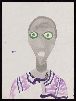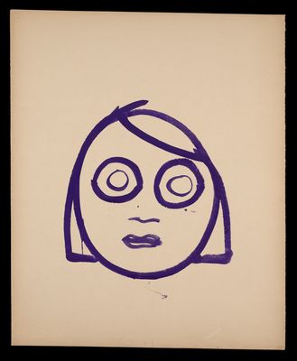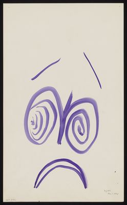 Spiral eyes and a downturned mouth in purple