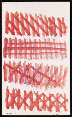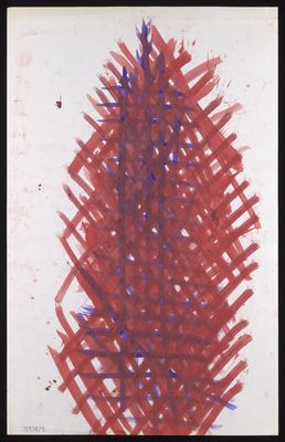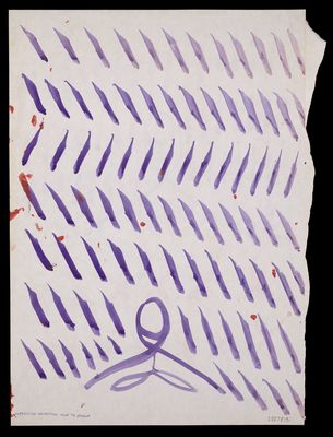 Purple diagonal and straight lines with loops, blotches and crosses in purple and red