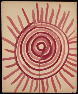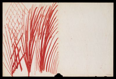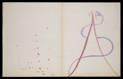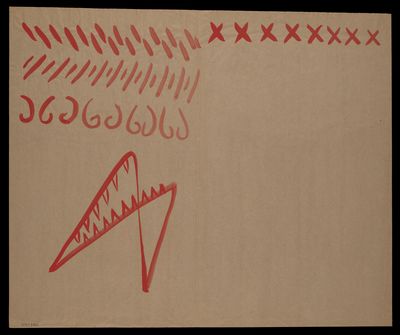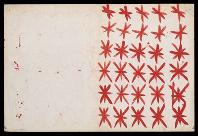 Red asterisk shapes, angular lines, a spiral and blotches