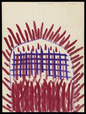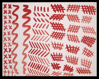 Red crosses, grids, and rounded, vertical and diagonal lines, and a face in profile