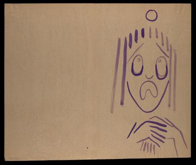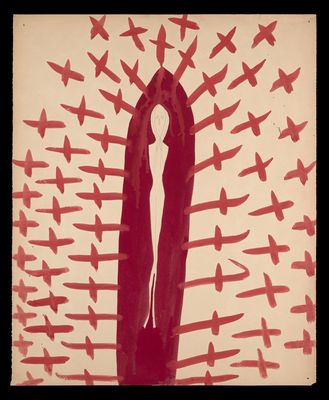 A face covered by two hands, with crosses and diagonal lines in red and purple above