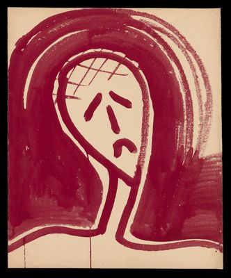 A head tilted to left with downturned mouth, surrounded by curved red lines