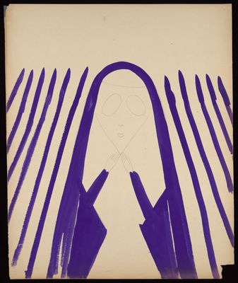 Figure in purple holding both hands to their chin with purple, possibly a nun, with diagonal lines to the left and right
