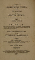 Burn's obstetrical works. The anatomy of the gravid uterus; with practical inferences relative to pregnancy and labour. Observations on abortion; containing an account of the manner in which it takes place; the causes which produce it; and the method of preventing or treating it. Practical observations on the uterine hemorrhage; with remarks on the management of the placenta / By John Burns, lecturer on midwifery, and member of the Faculty of Physicians and Surgeons in Glasgow. Three volumes in one.