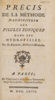 Précis de la méthode d'administrer les pilules toniques dans les hydropisies. Suivie de nouvelles observations faites par ordre de la cour sur les hydropisies, & les effets des pilules toniques / [Georges Frédéric Bacher].