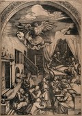 The birth of the Virgin Mary, Anna receives refreshments from attendants while the midwife gives Mary her first bath. Woodcut after A. Dürer, 1503.