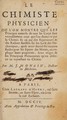 Le chimiste physicien, où l'on montre que les principes naturels de tous les corps sont veritablement ceux que l'on découvre par la chimie. Et où par des experiences et des raisons fondées sur les loix des méchaniques, aprés avoir donné des moyens faciles pour les separer des mixtes, on explique leurs proprietez, leurs usages, & les principaux phénomenes qu'on observe en travaillant en chimie / par J. Mongin.