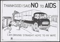 Two women run towards a transit goods van to greet the driver who has avoided AIDS to drive home to be with his wife; an AIDS prevention advertisement by the AIDS Control Programme, Ministry of Health, Uganda. Lithograph, ca. 1990's.