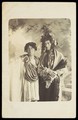 Two men in drag, one wearing a detailed feathered head garment, pose for a portrait. Photographic postcard by F. Wood, 190-.