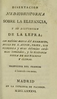 Disertación medicohistorica sobre la elefancia, y su distincion de la lepra; con noticias acerca del escorbuto, fuego de S. Anton, peste, lue venerea y otros dolencias cutáneas inmundas, y la historia fisica de los tiempos y climas / Traducida del frances é ilustrada con notas [by R.G].