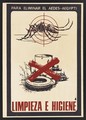 Yellow fever in Cuba: (above) the Aedes-aegypti mosquito, the carrier of yellow fever, seen as a target through a telescopic gun-sight; (below) a discarded tyre, oil drum etc. as places where the mosquito breeds. Colour screen print (?) after S. Goire Castilla, 198- (?).
