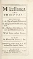 Miscellanea. The third part : Containing I. An essay on popular discontents. II. An essay upon health and long life. III. A defence of the Essay upon antient and modern learning. With some other pieces / By the late Sir William Temple ; Published by Jonathan Swift.