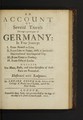 An account of several travels through a great part of Germany: in four journeys. I. From Norwich to Colen. II. From Colen to Vienna, with a particular description of that imperial city. III. From Vienna to Hamburg. IV. From Colen to London. Wherein the mines, baths, and other curiosities of those parts are treated of ... / By Edward Brown M.D.