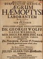 Quod Deus bene vertat! Disputatio medica, aegrum haemoptysi laborantem exhibens / quam sub praesidio ... Dn. Georgii Wolffgangi Wedelii ... publico eruditorum examini committit Julius Albertus Stockhausen ... M DC LXXIX.