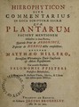 Hierophyticon sive commentarius in loca sanctae scripturæ sacræ quæ plantarum faciunt mentionem distinctus in duas partes, quarum prior de arboribus, posterior de herbis dicta complectitur / Auctore Matthæo Hillero. Cui accedit præfatio Salomonis Pfisteri ... continens B. auctoris vitam, merita, et libros tam editos quam manuscriptos.