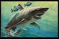 A shark poised to consume two people in the water representing a warning about the dangers of AIDS by the Kuwait Ministry of Health. Colour lithograph, ca. 1995.