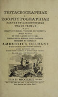 Testaceographiae ac zoophytographiae parvae et microscopicae ... / in qua minuta et minima testacea ac zoophyta maris nativa vasculis inclusa aeneisque tabulis insculpta describit et explicat Ambrosius Soldani ... accedit supplementum analysim continens marini sedimenti.