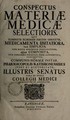 Conspectus materiae medicae selectioris. : Quo eliminatis plurimam partem obsoletis, medicamenta usitatiora, tam simplicia, quam composita, ... exhibenter ... iussu et auctoritate illustris senatus, cura et opera Collegii Medici praescriptus et adornatus.