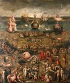 An angel leading a soul into hell. Oil painting by a follower of Hieronymus Bosch.