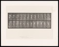 A naked man runs up to a set of cricket stumps, pauses, turns and throws a ball with his right hand. Collotype after Eadweard Muybridge, 1887.