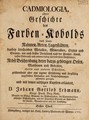 Cadmiologia, oder Geschichte des Farben-Kobolds nach seinen Nahmen, Arten, Lagerstädten, darbey brechenden Metallen, Mineralien, Erzten und Steinen : wie auch dessen Verhältniss nach der Probier-Kunst, dessen Gebrauch und andern dabey vorfallenden Umständen nebst Beschreibung derer darzu gehörigen Oefen, Maschinen und Arbeiten. Theils aus andern Schriften, grösstentheils aber aus eigener Erfahrung und sorgfältig angestellten Versuchen und Wahrnehmungen zusammen getragen, und mit denen nöthigen Kupfern erläutert / von D. Johann Gottlob Lehmann.