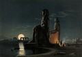Colossal statues of Memnon (Pharaoh Amenhotep III), seen during the flooding of the Nile, Thebes, Egypt. Coloured lithograph by Louis Haghe after David Roberts, 1849.