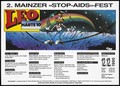 A cartoon-figure called 'Leo' juggles a video, a bottle, a condom, a syringe and a pill box while standing on a tight-rope above a crater against a starry night sky; advertising the 2nd 'Stop AIDS' festival in Mainz, 1990. Colour lithograph by Klaus.