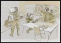 Medical staff in training in Yorkshire for operations in Helmand Province, Afghanistan. Watercolour by Julia Midgley, 2012.