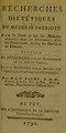 Recherches diététiques du médecin patriote : sur la santé et sur les maladies observées dans les séminaires, dans les pensionnats, et chez les ouvrières en dentelle. Suivies de réflexions sur le traitement de la petite vérole, et d'un mémoire sur le régime des convalescens et des valétudinaires / Par C.D. Balme.