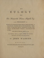 An eulogy on the Honourable Thomas Russell, Esq : late president of the Society for Propagating the Gospel among the Indians and Others, in North America ; the Humane Society of the Commonwealth of Massachusetts ; the Agricultural Society ; the Society for the Advice of Immigrants ; the Boston Chamber of Commerce ; and the National Bank in Boston ; who died at Boston, April 8, 1796 ; delivered, May 4, 1796, before the several societies to which he belonged / by John Warren.