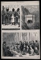 Opening of the Fréjus Rail Tunnel: a group of soldiers with false moustaches and beards stand with swords, a mace and a furled flag. Wood engraving by C.J.B. (?) after R. Linklater, 1871.