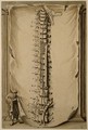 Vertebral column with dissections of nerves and blood vessels, with skin (?) in the background, and (left) the figure of a man representing Ecclesiastes, the whole being an illustration of Ecclesiastes XII, 6 "the silver cord". Drawing attributed to Johann Melchior Füssli, ca. 1730.