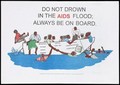 People being rescued from a flood in a boat bearing messages about safe sex and condoms; an advertisement for safe sex to prevent AIDS by the STD/AIDS Control Programme, Ministry of Health, Uganda. Colour lithograph by Tahley (?), 1995.