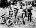 M0013696: A Dyak man teaching boys to use a blowpipe, Borneo
