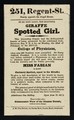 251, Regent-St. nearly opposite the Argyll Rooms : to be seen daily, the beautiful Giraffe Spotted Girl ... Miss Fabian is most curiously spotted, equal to the giraffe ...