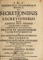 I. N. J. Dissertatio inauguralis medica de secretionibus et excretionibus : quam auspice deo triuno archiatro summo consensu et auctoritate inclytae et gratiosissimae facultatis medicae in alma Argentoratensium Universitate pro licentia summos in arte medica honores et privilegia doctoralia rite capessendi / solenni eruditorum examini subjicit Johannes Philippus Elvert, Spirensis. Ad diem [blank] Januarij Anno M DCC XIV.