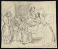 A young woman on her deathbed surrounded by four people: one of them holds a mirror in front of her. Drawing by H. Lalaisse, 18--.