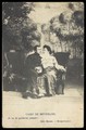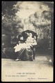 Two soldiers, one in drag, sit close to each other on stage, in front of a detailed backdrop of trees at Beverlo Camp, Belgium. Process print, 190-.