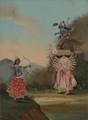 Rama (left) and Hanuman (above, right) fighting the demon Ravana (right). Oil (?) painting.