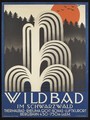Water-fountains, the Black Forest, and a red sunset, representing the health resort Wildbad im Schwarzwald (Baden-Württemberg). Colour lithograph after A. Fischinger, 192-.