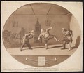 Three men wearing orthopedic apparatus exercising; another is strapped into leg braces. Aquatint by P. Sandby (?), 1783.