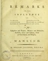 Remarks on the influence of climate, situation, nature of country, population, nature of food, and way of life, on the disposition and temper, manners and behaviour, intellects, laws and customs, form of government, and religion, of mankind / by William Falconer, M.D.F.R.S.