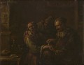 A surgeon removing a plaster from the back of a man's hand. Oil painting after (?) Egbert van Heemskerck.