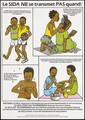 Four illustrations demonstrating ways in which you can not get AIDS from (French version); an advertisement for AIDS education from the Ministry of Health AIDS Control Programme. Colour lithograph, ca. 1995 (?).