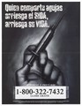 A hand with a syringe and a warning about the dangers of drugs and AIDS in Spanish; advertisement for an AIDS information line by the Long Beach Health Department. Lithograph by F (...).